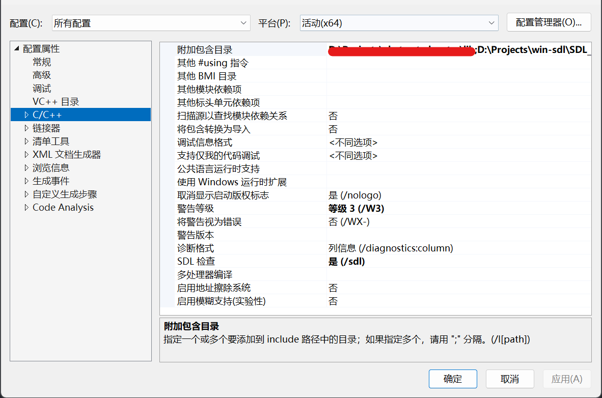 在“配置属性>C/C++”中,选择“附加包含目录”,新建[SDL路径]\include项。