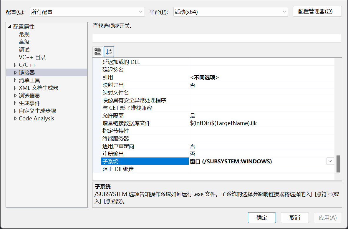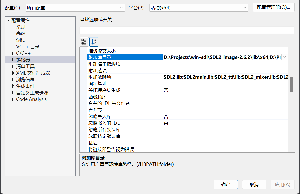 在“配置属性>链接器>所有选项”中,首先选择“附加库目录”,新建[SDL路径]\lib\[x64/x86]项;然后选择“附加依赖项”,新增SDL2.lib及SDL2main.lib,最后将“子系统”更改为窗口(/SUBSYSTEM:WINDOWS)。